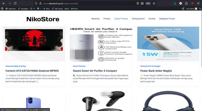 Website dilengkapi dengan halaman utama, katalog produk, ulasan produk (berbasis blog), tentang kami, kontak, serta kebijakan privasi sehingga tampil profesional layaknya e-commerce penuh.