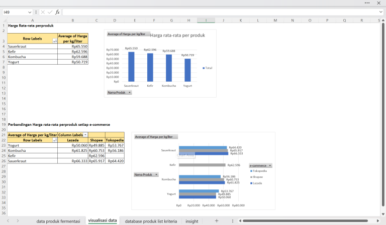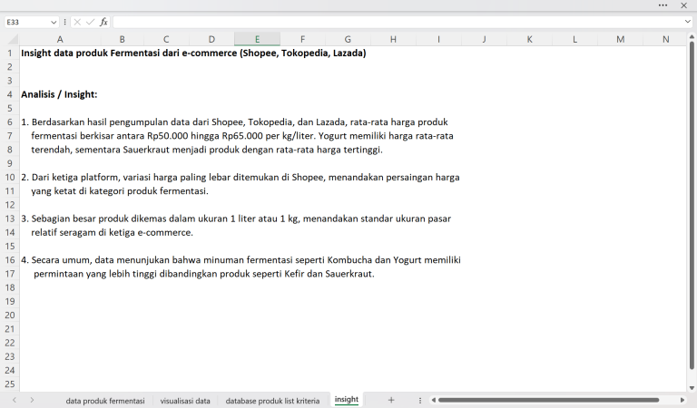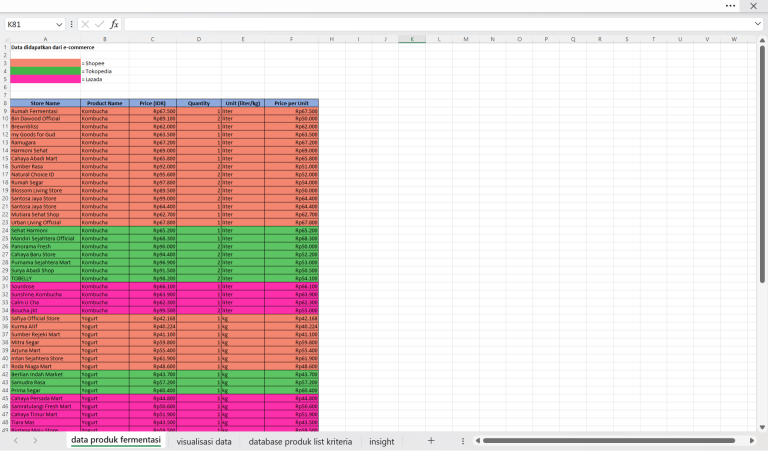 Proyek ini bertujuan untuk melakukan pencarian, penginputan, visualisasi, dan analisis data produk fermentasi (Kombucha, Yogurt, Kefir, dan Sauerkraut) dari tiga platform e-commerce besar: Shopee, Tokopedia, dan Lazada. Data digunakan untuk mendukung kebutuhan market research dan strategi marketing klien.